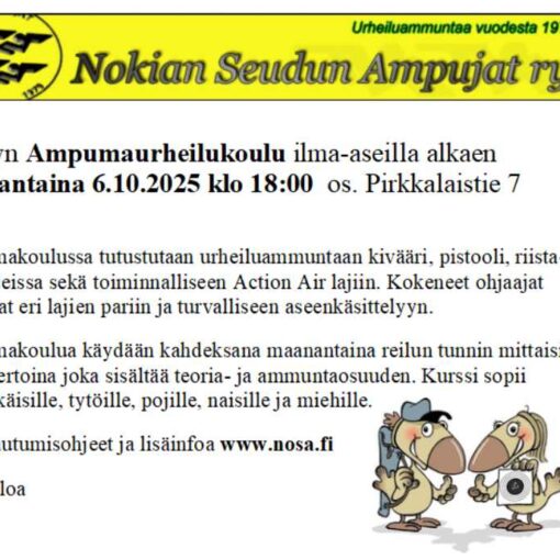 NoSA tarjoaa kaikille mahdollisuuden tulla tutustumaan ja kokeilemaan urheiluammuntaa Lauantaina 24.9.2022 klo 11-15 välisenä aikana.Sisäampumaratamme sijaitsee Nokian Portissa, vanhassa jalkinetehtaassa. Käynti Nokian […]